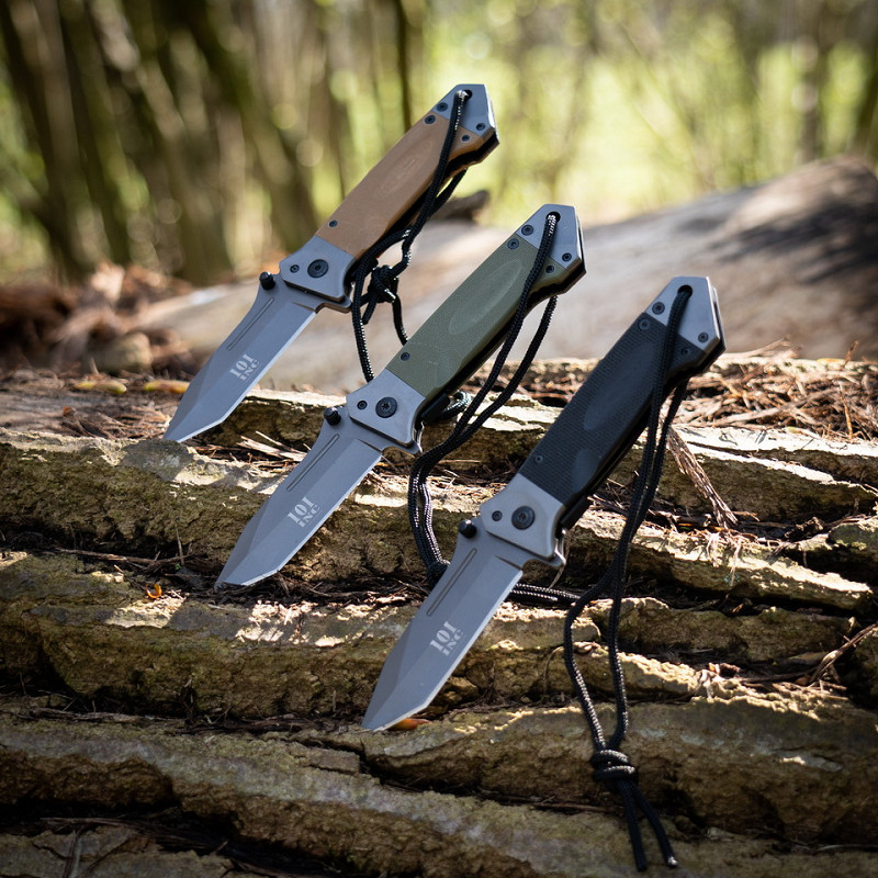 Sturdy and reliable pocket knife, designed for heavier applications. The knife has a tactical black finish and a robust construction, suitable for bushcraft, camping, and everyday use. The knife has an attachment eye at the end of the handle for attaching to a lanyard or rope.