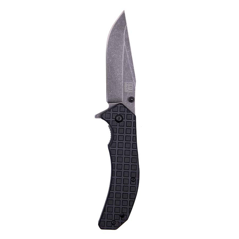 The rescue knife is stone washed and the blade is made of 420 stainless steel. This pocket knife has a finger stop for holding the knife during use. The knife has an attachment eye at the end of the handle for attaching to a lanyard or rope.