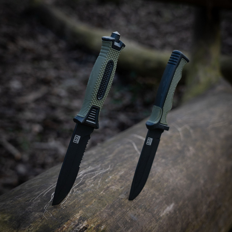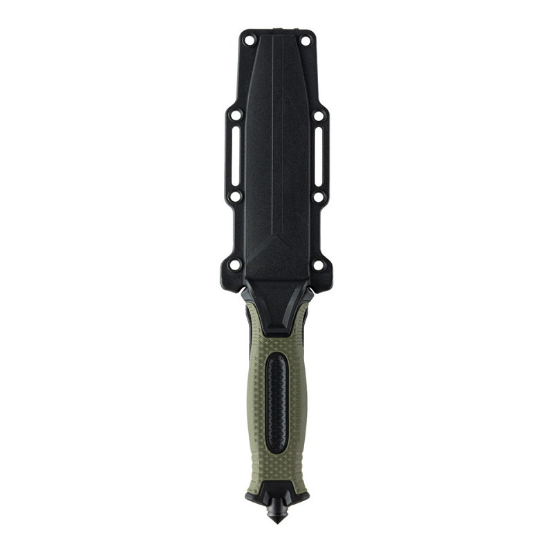 The blade is made of 3Cr13SS stainless steel, which ensures long-lasting sharpness and excellent resistance to rust. The knife is suitable for use in humid environments, water, and with light exposure to chemicals. The plastic handle provides grip and is equipped with a glass breaker at the end for emergency situations. The knife comes with a sheath for safe and easy carrying.