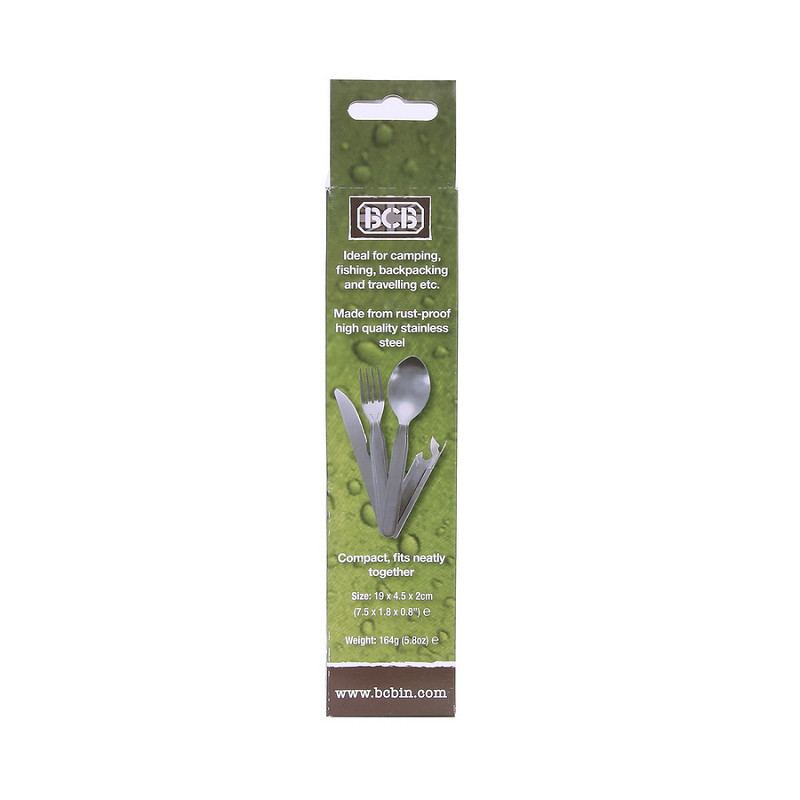 Compact stainless steel cutlery set, ideal for camping, fishing, backpacking, and traveling. The knife, fork, and spoon fit neatly together and take up minimal space. Made from high-quality stainless steel for long-lasting use.