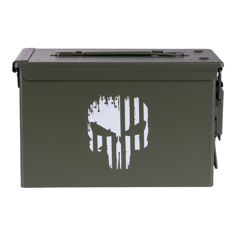 Discover our 50 Cal. Ammo Box – Punish Skull, a unique military-style ammunition box. Perfect for storing airsoft gear, ammunition, fishing equipment, electronics, camera gear, and more!