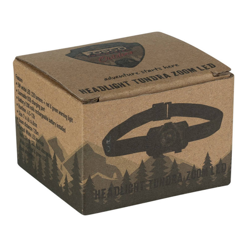 Headlamp with various functions from Fosco Industries. Equipped with an elastic headband that can be adjusted in size. Equipped with a rechargeable battery and multiple light functions. Ideal for outdoor activities, such as camping, bushcraft, hiking, etc. LED is zoomable.