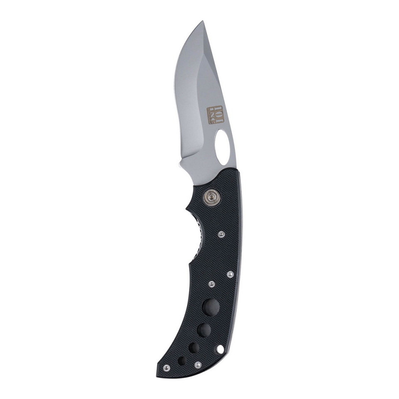 Sturdy pocket knife with a metal blade and black handle. The knife has a clip, making it easy to attach to a belt or bag. The design includes a thumb hole for smooth opening and an ergonomically shaped handle for a good grip.