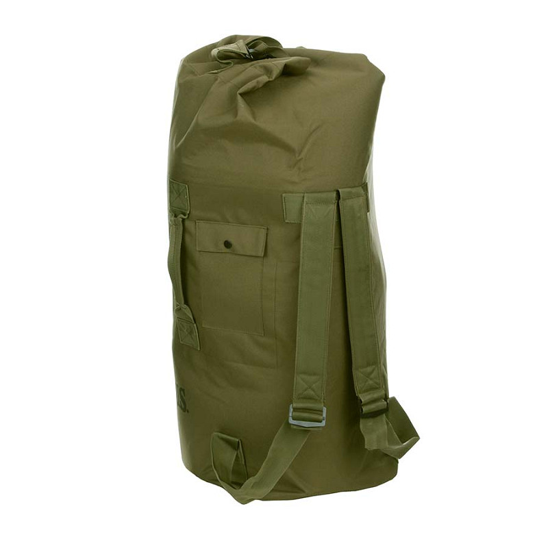 Also provided with a handle and shoulder strap for easy portability. At the top 6 metal rings to close the duffel bag.