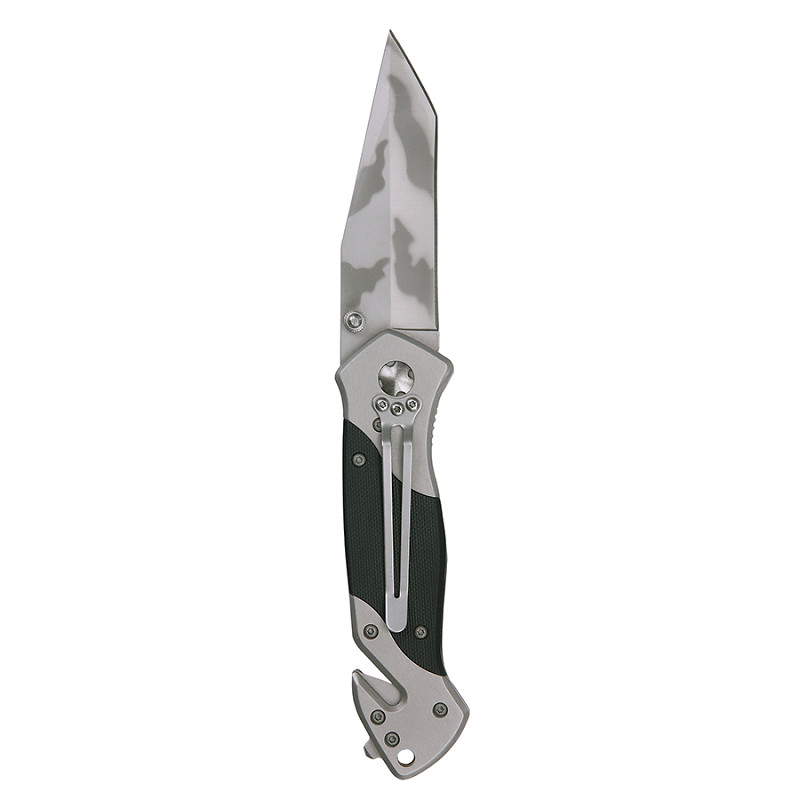 At the bottom, you will find a glass breaker and a belt cutter. The knife opens smoothly with the thumb rest, while the liner lock ensures a secure lock during use.