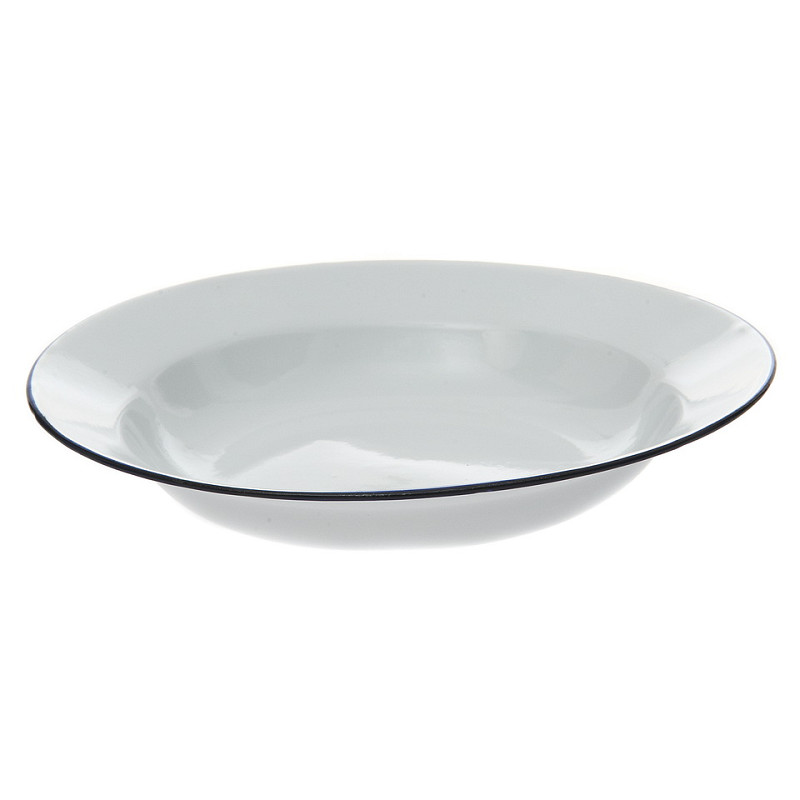 Deep enamel plate. White enameled steel with a blue border. High quality enamel and wear resistant.