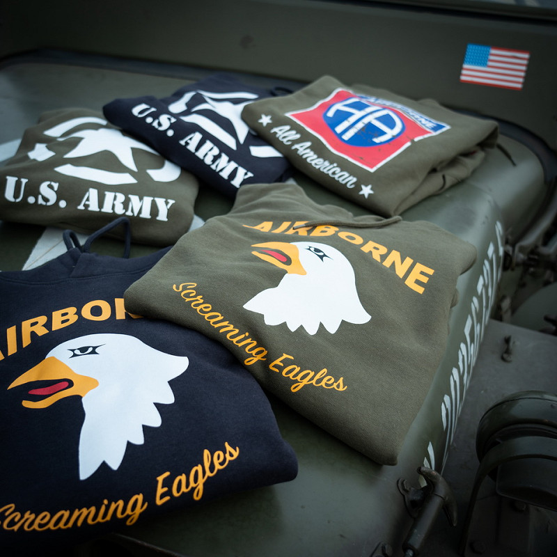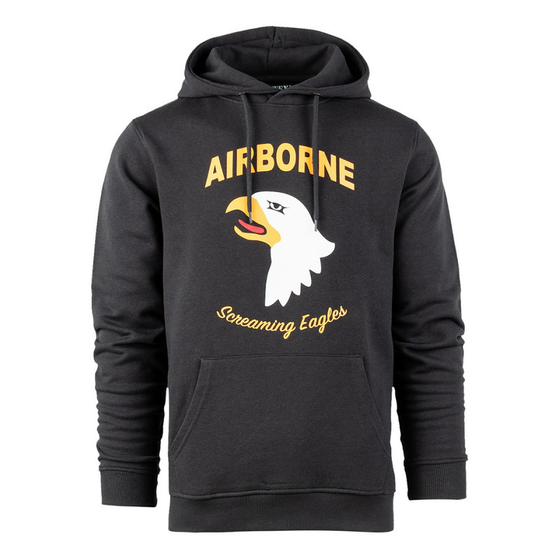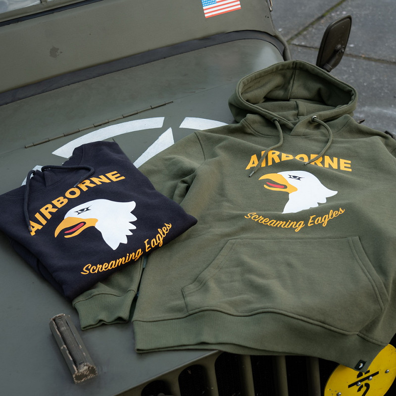 The hoodie features a screaming eagle print. The screaming eagle is known from the 101st Airborne Division. This infantry division of the U.S. Army was deployed in World War II, the Vietnam War and the wars of Iraq and Afghanistan