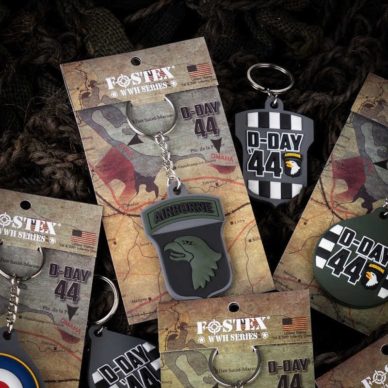 From our Fostex WWII series, a nice PVC key ring. Features a logo on two sides, the Invasion Stripes/D-Day '44 and with the black and green Screaming Eagle.