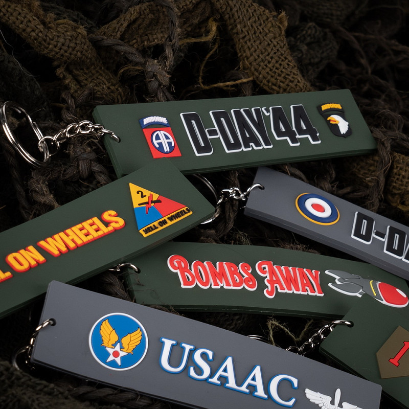 From our Fostex WWII series a nice pvc keychain. Features a logo on two sides, the Invasion Stripes/D-Day '44 and with the Screaming Eagle/D-Day'44/101st Airborne.