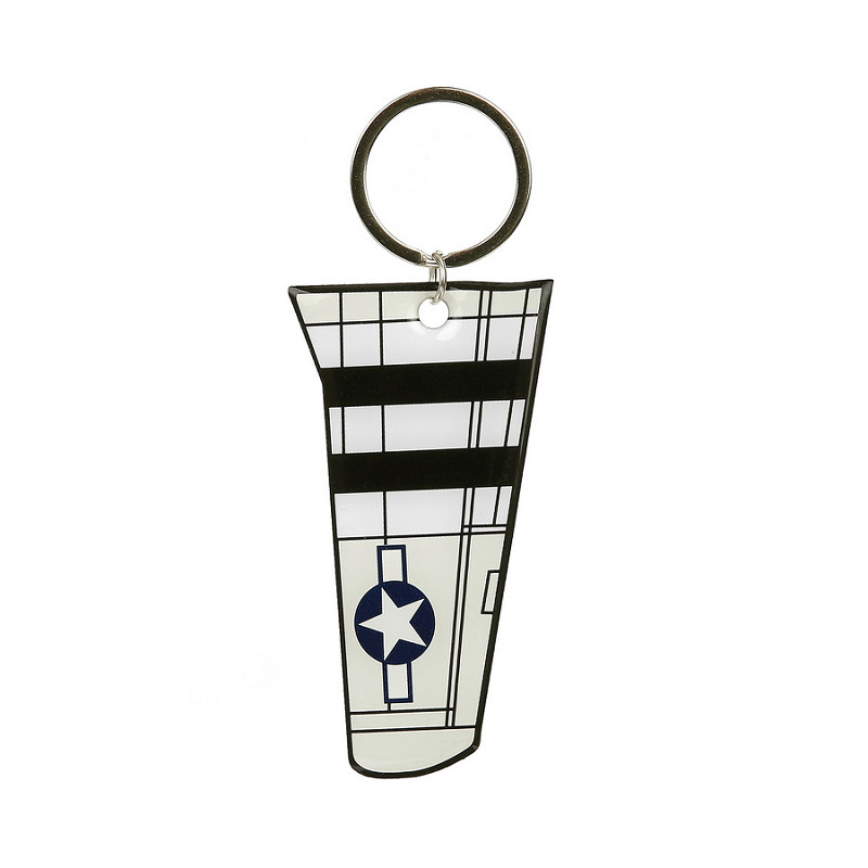 Metal key ring of the P-51 Mustang wing with D-Day striping. Unique product! Nice to attach to your keys or backpack!