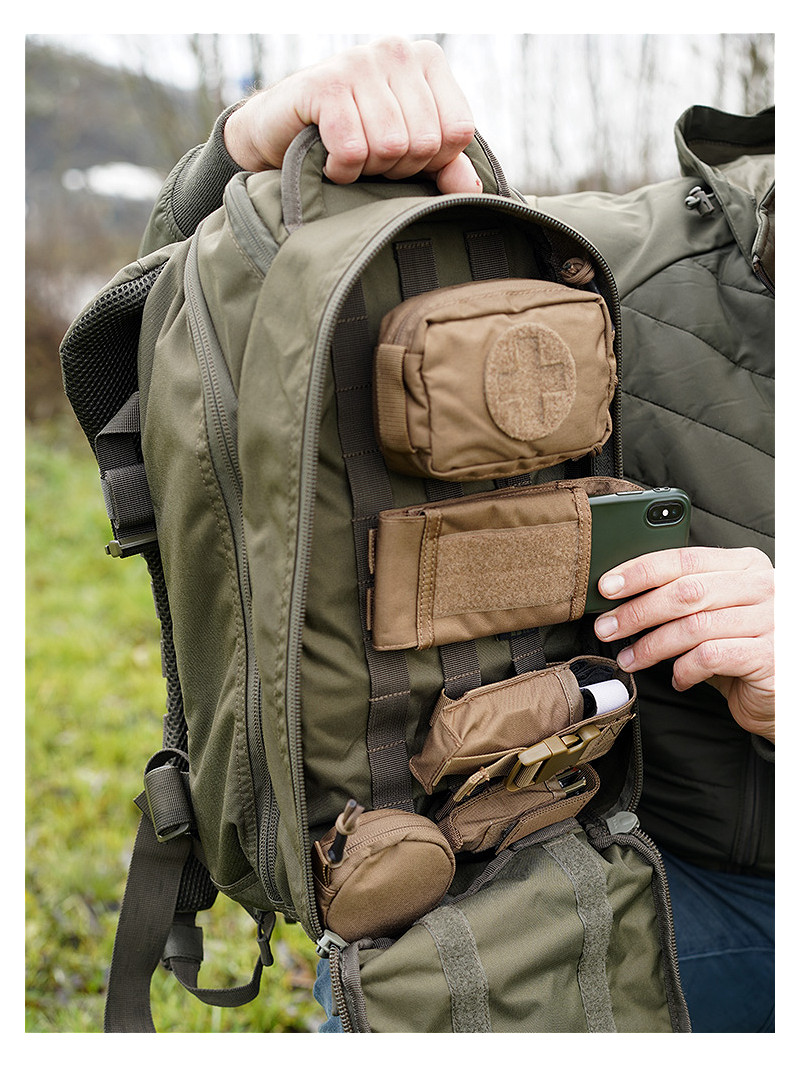 - Front pocket has MOLLE strap on the inside to attach different pouches