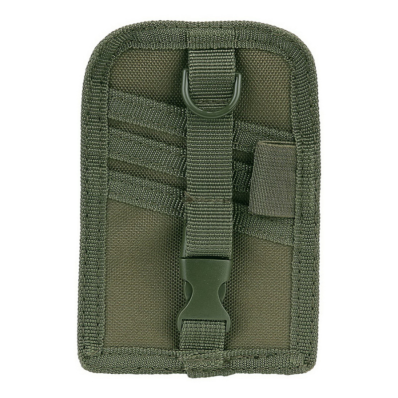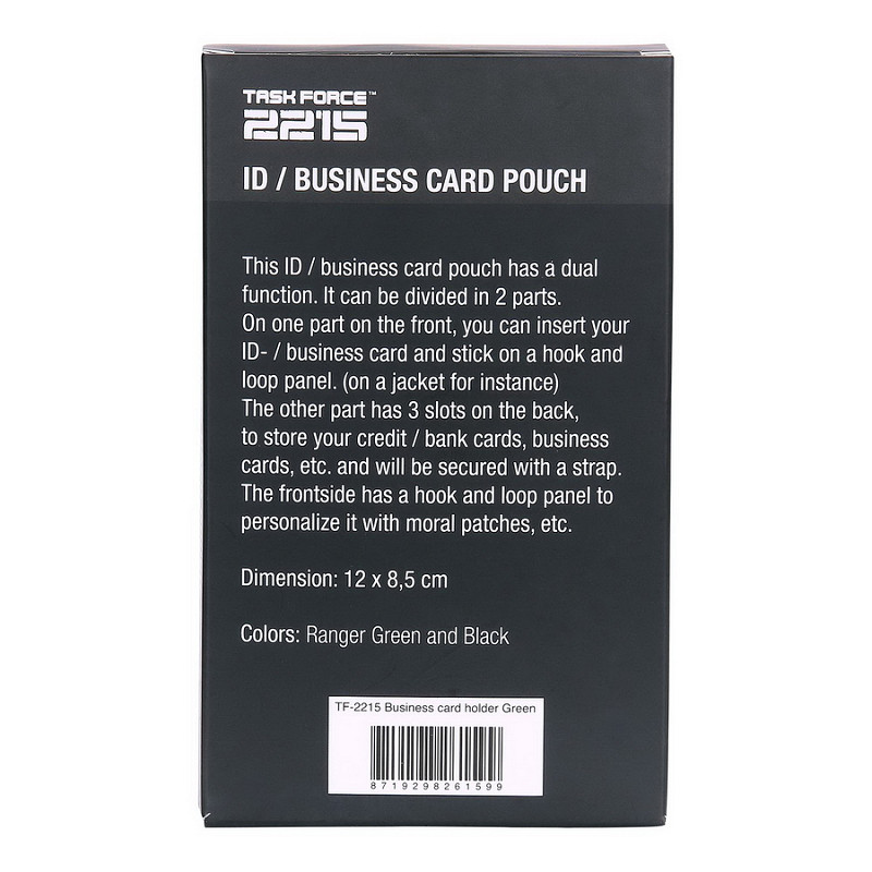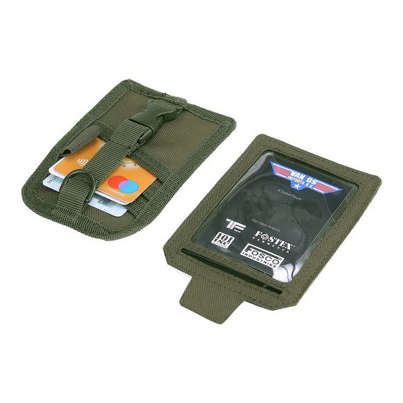 The other side has 3 slots to store your credit/ID/bank cards, business cards, etc. and will be secured with a strap. The backside has a hook and loop panel to personalize it with moral patches, etc.