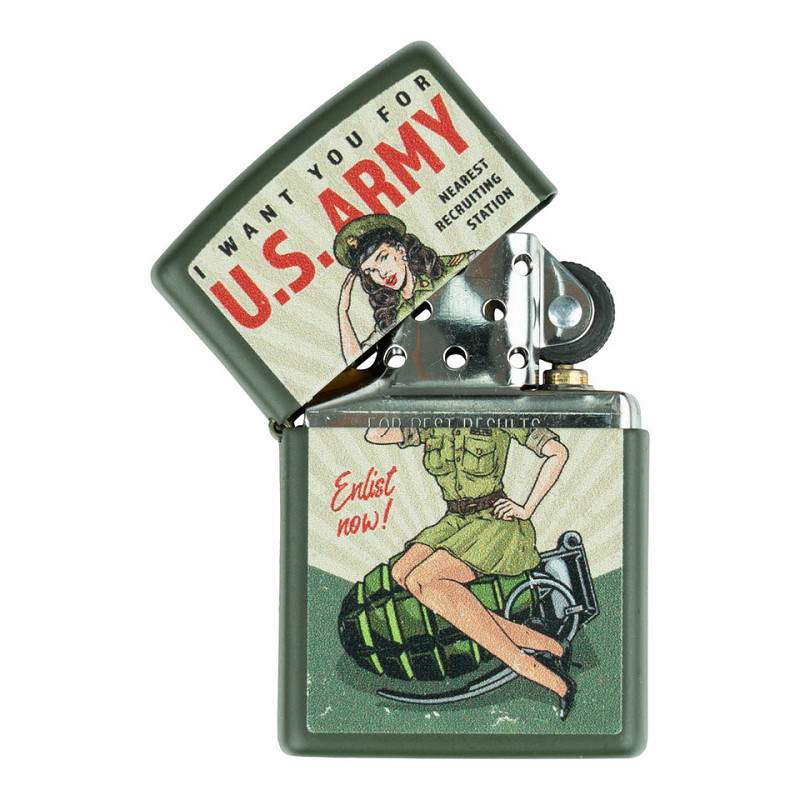 Inspired by classic American wartime enlistment posters. This Zippo combines military pride with iconic pin-up glamour. The illustration of the U.S. Army Enlist Pin-Up symbolizes charm, morale, and vintage Americana.