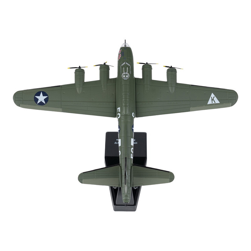 Discover this detailed Die-cast model of the B-17 Flying Fortress USA. The iconic bomber, renowned for its crucial contributions during WWII, stands on a display base. Perfect for collectors and aviation enthusiasts!