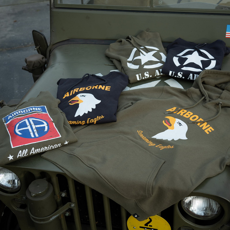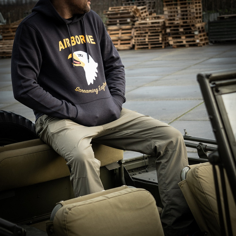 La sudadera con capucha tiene un estampado de un águila gritando. El águila gritona es conocida por la 101ª División Aerotransportada. Esta división de infantería del ejército estadounidense entró en acción en la Segunda Guerra Mundial, la Guerra de Vietnam y las guerras de Irak y Afganistán.