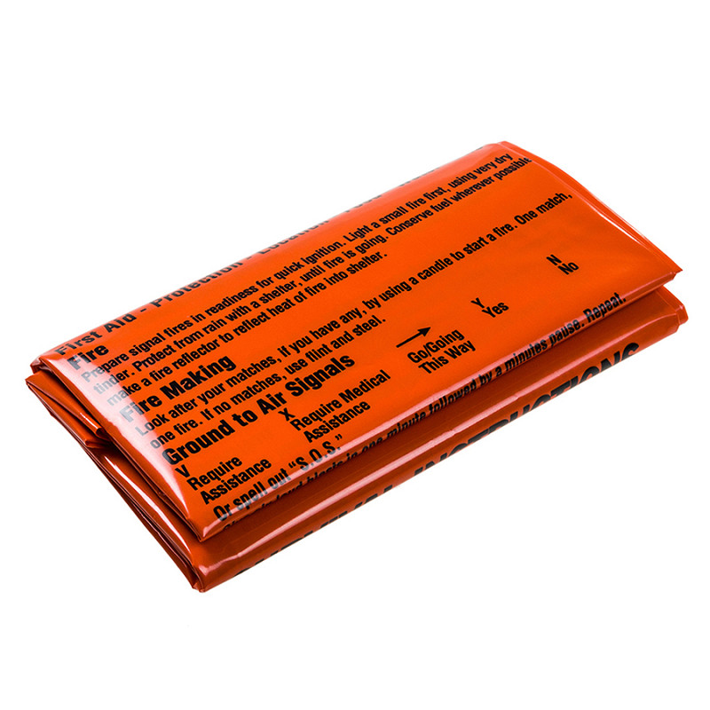U sac de survie, imprimé avec des informations de survie, haute visibilité, très haute protection contre le froid, la chaleur, l'humidité.