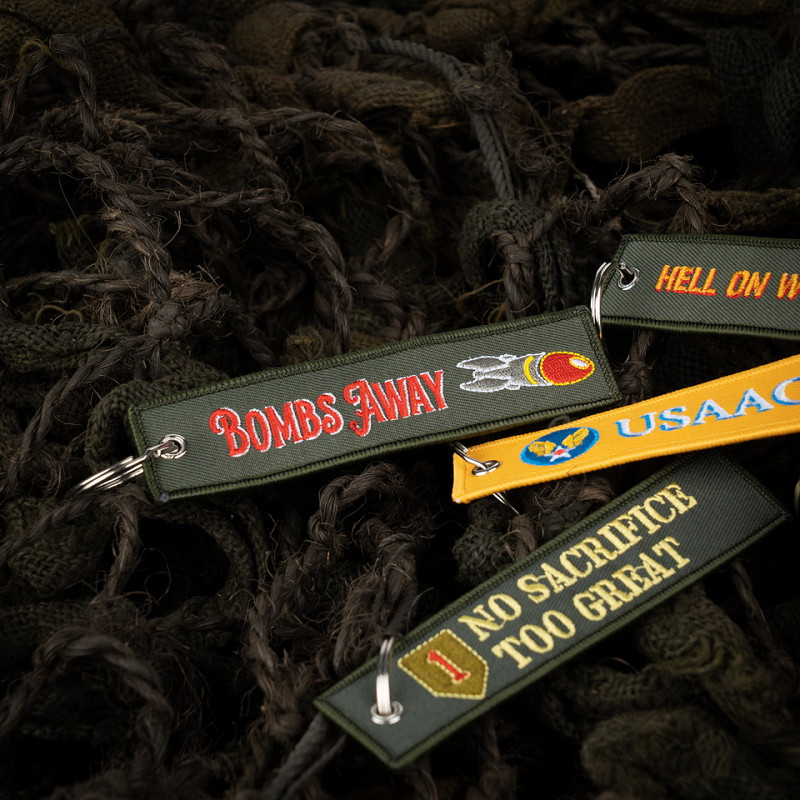 Porte-clés très finement tissé en 100 % tissu. La finesse du tissage rend cet emblème très détaillé. La phrase "Bombs away" a été utilisée pour la première fois par les pilotes américains pendant la Seconde Guerre mondiale et est devenue un slogan populaire à l'époque.