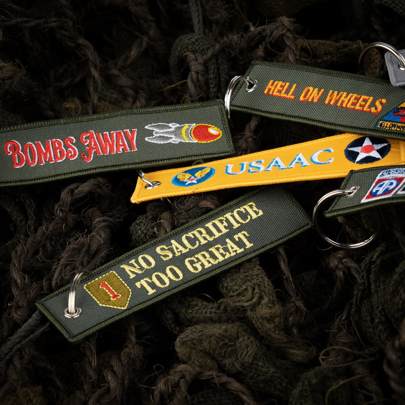 Porte-clés très finement tissé en 100 % tissu. La finesse du tissage rend cet emblème très détaillé. Logo sur les deux faces, no mission too difficult/no sacrifice too great.