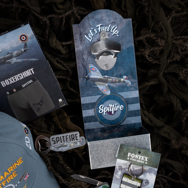 Op de opdruk van de bieropener is de Supermarine Spitfire te zien, een Engels jachtvliegtuig dat in WO2 een belangrijke rol speelde tijdens diverse luchtgevechten boven de EU.