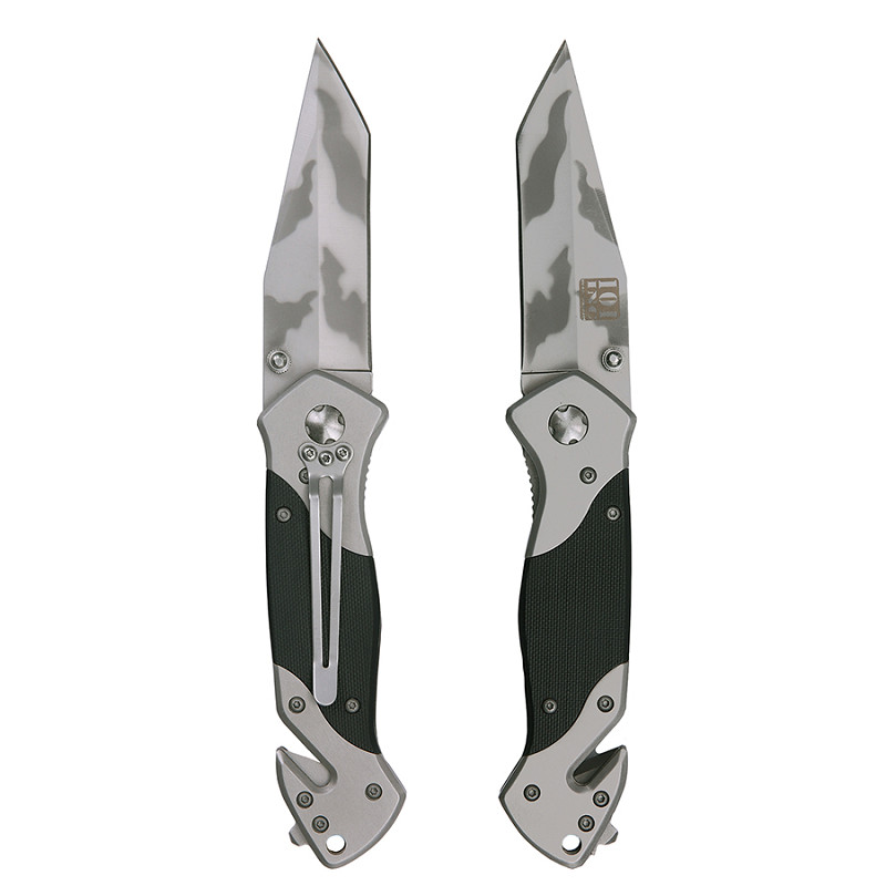 Onderaan vind je een glasbreker en een gordelsnijder. Het mes open je soepel met de duimsteun, terwijl de linerlock zorgt voor een veilige vergrendeling tijdens gebruik.
