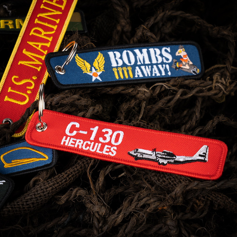 Zeer fijngeweven sleutelhanger van 100% stof. Door de fijne weving is dit embleem zeer gedetailleerd. De sleutelhanger heeft een rode kleur. Op de ene kant staat de spreuk REMOVE BEFORE FLIGHT. Op de andere kant staat de C-130 Hercules dit is een middelzwaar transportvliegtuig van Lockheed. Het is een viermotorige turboprop die in gebruik is bij vele NAVO-krijgsmachtdelen